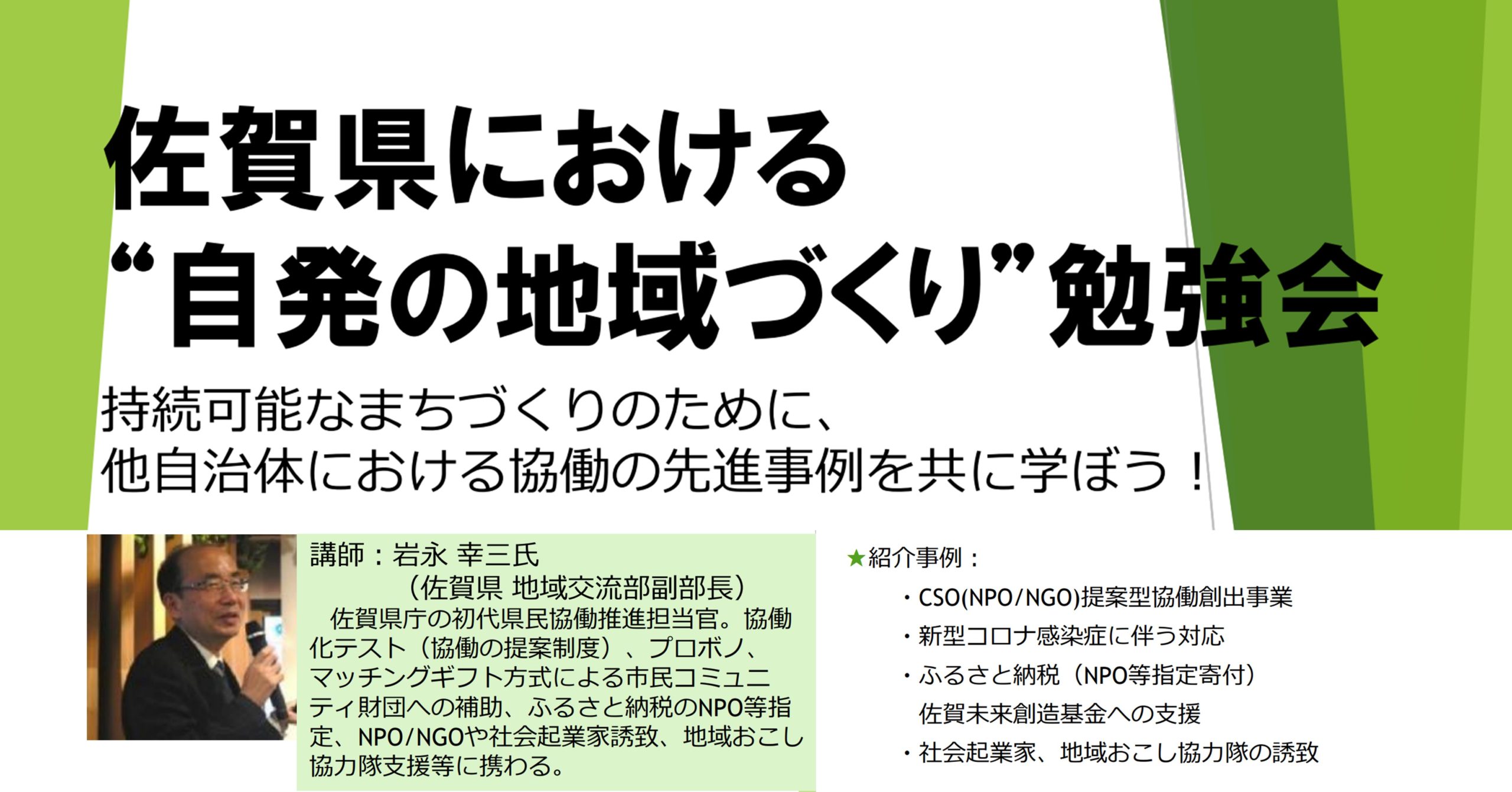 講師: 岩永 幸三氏(佐賀県 地域交流部副部長)佐賀県庁の初代県民協働推進担当官。協働化テスト(協働の提案制度)、プロボノ、マッチングギフト方式による市民コミュニティ財団への補助、ふるさと納税のNPO等指定、NPO/NGOや社会起業家誘致、地域おこし協力隊支援等に携わる。
